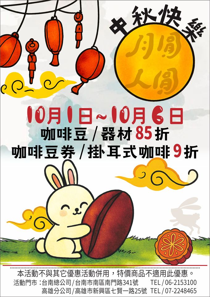 尚品咖啡 114年 中秋節優惠活動! 活動日期自 10.1~10.6止 台南總公司.高雄分公司:咖啡豆,器材85折 / 咖啡豆卷,掛耳式咖啡9折 (註:本活動僅提供 現場購買,恕不提供網路下單,如有不便,敬請見諒)